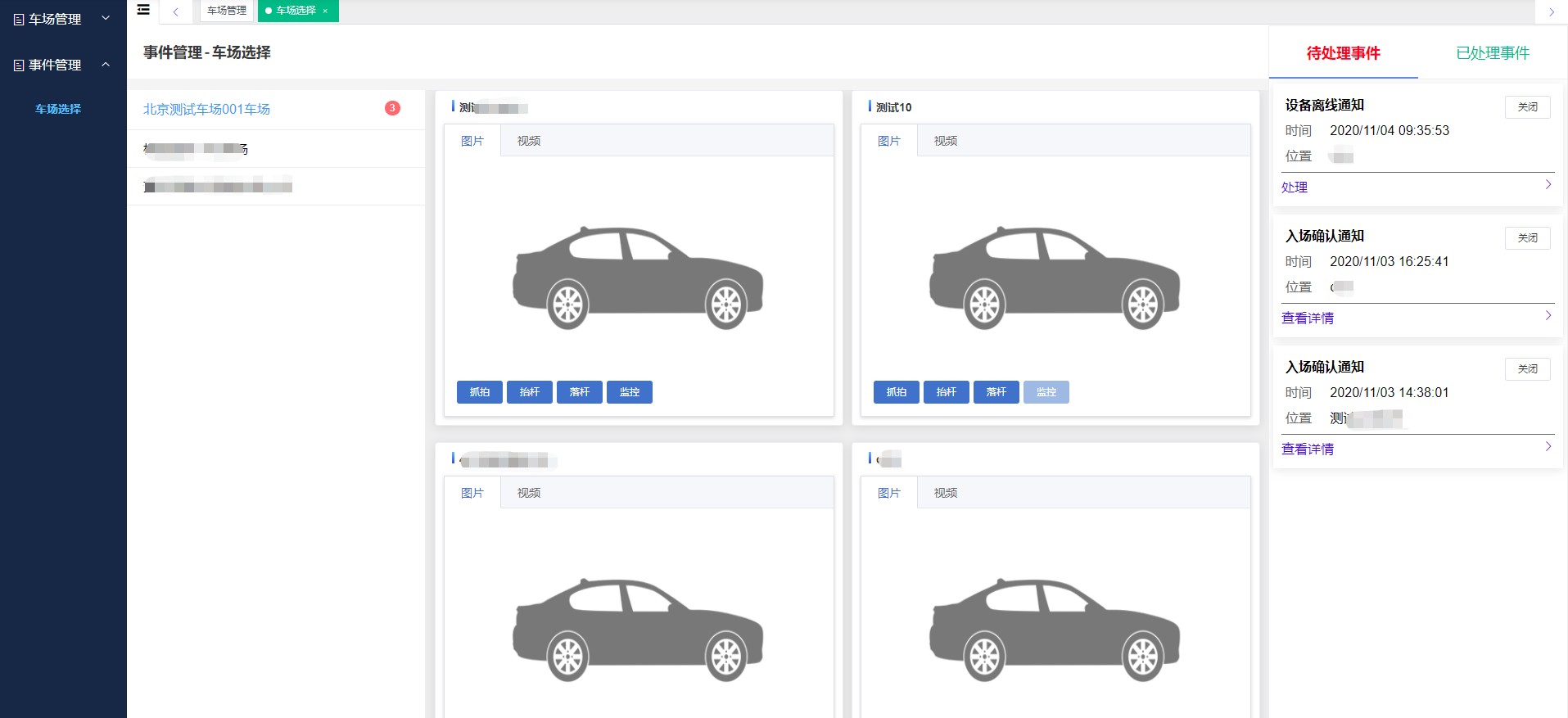 運(yùn)維后臺可同時查看所管轄的多個車場的通道視頻、操作抬桿/落桿、接聽現(xiàn)場呼叫以及處理異常事件