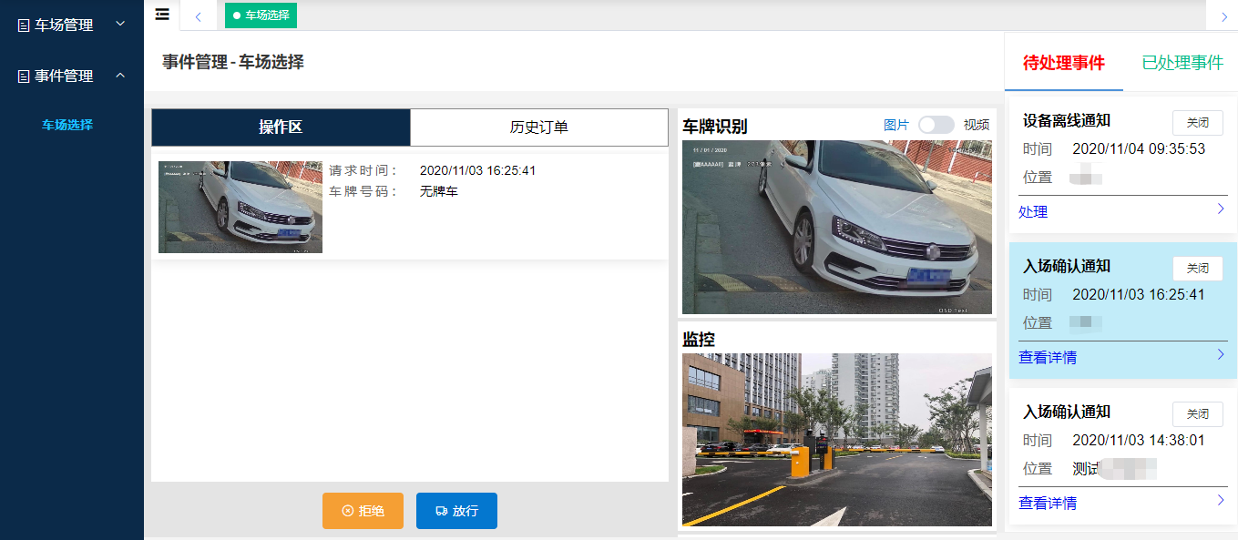 云平臺可統(tǒng)一處理多個車場的現(xiàn)場異常情況,例如無牌車入場確認(rèn)申請、語音呼叫等事宜。