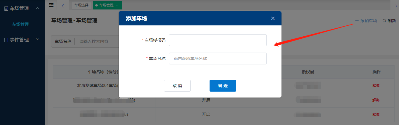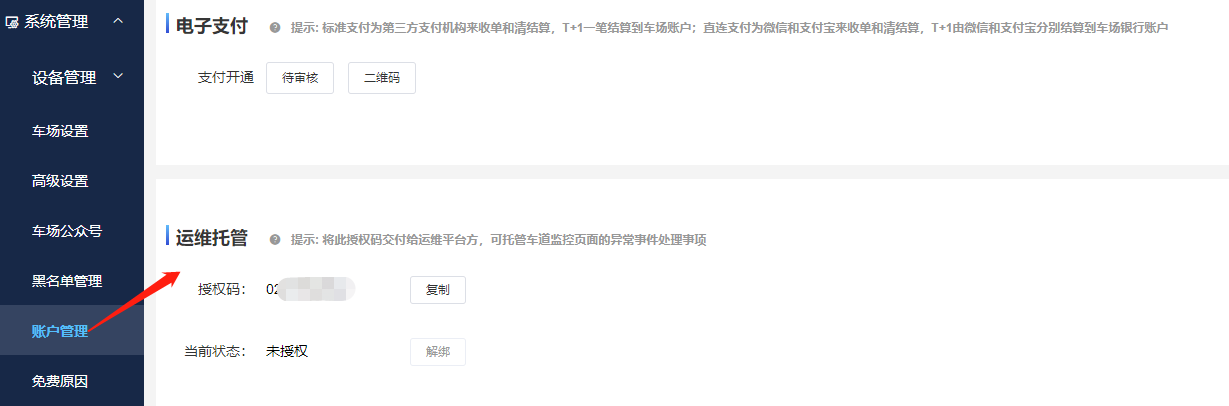 車場登錄云平臺,系統(tǒng)管理模塊的賬戶管理頁面,復(fù)制授權(quán)碼交于運(yùn)維平臺方綁定,即可托管車場異常時間處理事宜。