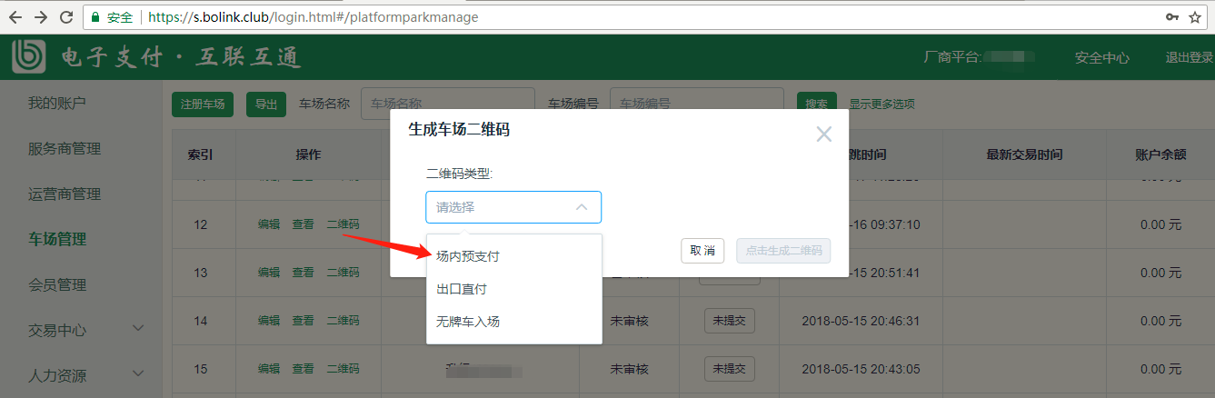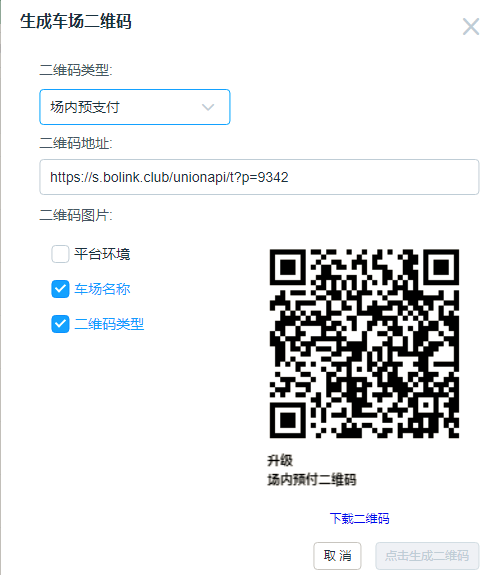 1.1、廠商平臺管理員登錄本廠商的泊鏈后臺,選擇車場管理模塊,在需要生成場內(nèi)預(yù)付碼的車場點擊“生成車場二維碼”,二維碼類型選擇“場內(nèi)預(yù)支付”,即可生成對應(yīng)二維碼。可勾選該圖片下方的標(biāo)記項、可下載圖片、可復(fù)制二維碼地址。