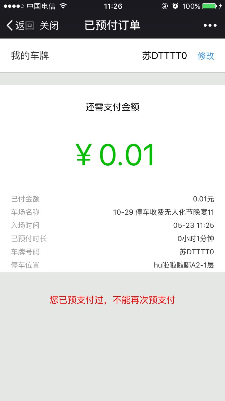 當(dāng)前泊鏈只支持一次預(yù)付,再次掃碼會提示已預(yù)付。
