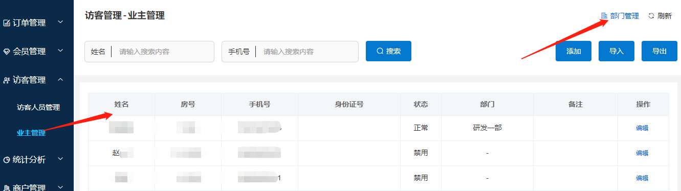 車場(chǎng)可添加或?qū)霕I(yè)主信息(手機(jī)號(hào)唯一),狀態(tài)“正常”和“禁用”對(duì)應(yīng)訪客管理的“認(rèn)證”和“非認(rèn)證”。