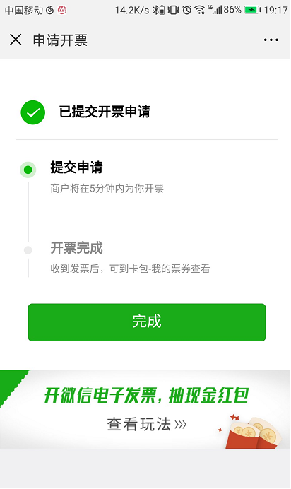 開票申請?zhí)峤怀晒?,開票完成后可收到開票提醒的服務(wù)通知,在微信卡包、我的票券查看發(fā)票。