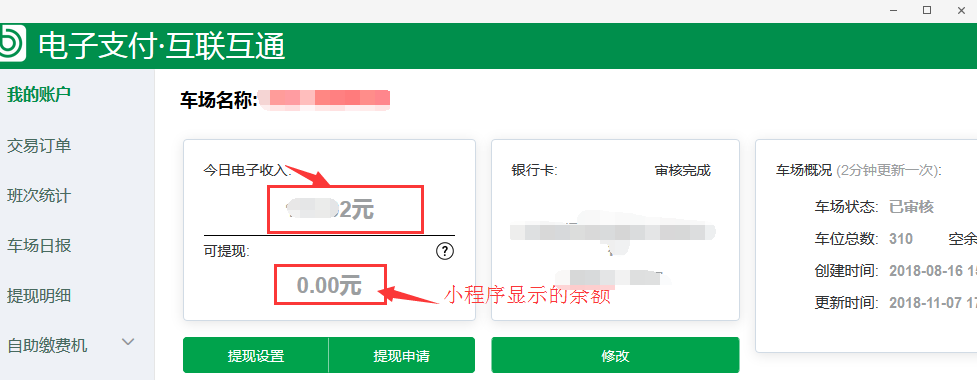 2、可提現(xiàn)余額為0,停車場收銀臺小程序余額為0