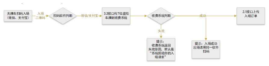 1、無牌車入場(chǎng):泊鏈廠商后臺(tái)生成對(duì)應(yīng)入口的二維碼,做成燈箱等物料形式貼在入口處,車主通過微信或支付寶掃一掃,然后泊鏈發(fā)送生成的無牌車(7位數(shù)字和字母組合)入場(chǎng)消息給入場(chǎng)通道對(duì)應(yīng)的停車收費(fèi)系統(tǒng),系統(tǒng)判斷是否允許入場(chǎng)。