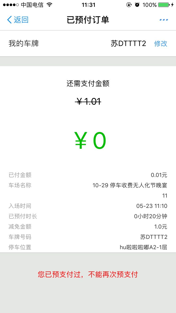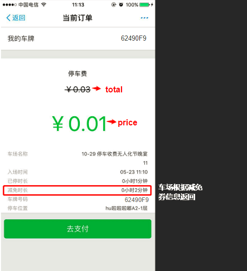 上圖所示,綠色數(shù)值為當(dāng)前應(yīng)收金額,是減免之后還需支付的金額,車主可當(dāng)前預(yù)付也可出場(chǎng)時(shí)支付。
