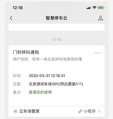 在綁定員工微信時(shí),需關(guān)注“智慧停車云”公眾號(hào),之后的消息會(huì)在這個(gè)公眾號(hào)里推送該員工。點(diǎn)擊該消息跳轉(zhuǎn)至“云車場(chǎng)管家”小程序可免登陸接聽(tīng)該呼叫。