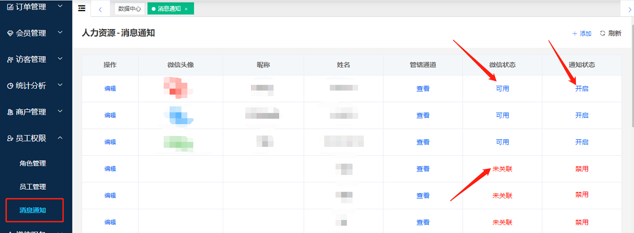 員工管理模塊的“消息通知”頁(yè)面給指定員工綁定微信,并設(shè)置接收消息推送的通道、事件類型和接收時(shí)間段(默認(rèn)是全天接收),開(kāi)啟推送即可。
