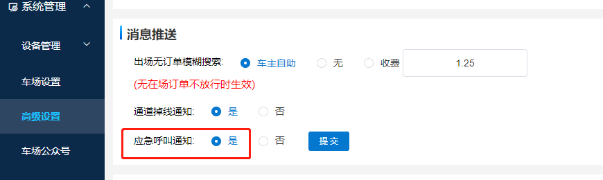 2、車場(chǎng)在高級(jí)設(shè)置中:選擇無(wú)訂單時(shí)“車主自助”,且打開(kāi)應(yīng)急呼叫通知的開(kāi)關(guān)