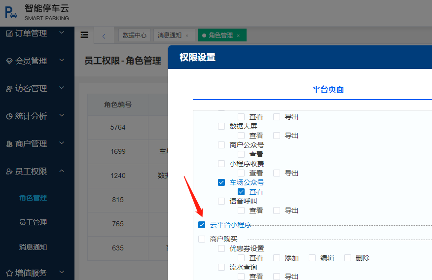 注:修改該員工所屬角色的權(quán)限時(shí)要勾選“云平臺(tái)小程序”