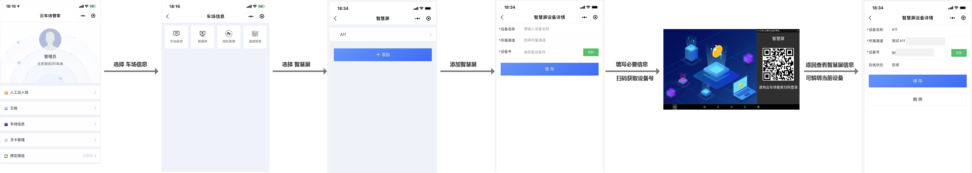 智慧屏的綁定與解綁在“云車場管家”小程序中均可操作,掃碼獲取當前智慧屏設(shè)備 ID ,選擇當前安裝的通道即可綁定投入使用。