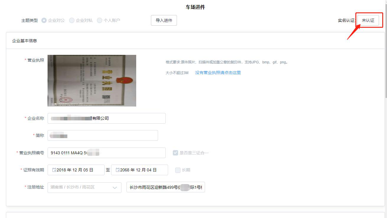 第一步:登錄后臺(tái)進(jìn)件頁(yè)面右上角,點(diǎn)擊未認(rèn)證按鈕