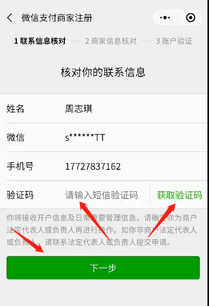 3:確認(rèn)信息,點(diǎn)擊“獲取驗(yàn)證碼”,接受短信驗(yàn)證碼后填入短信驗(yàn)證碼,點(diǎn)擊“下一步”