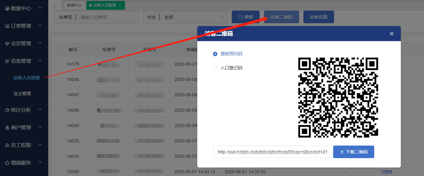 車場管理員登錄云平臺,在“訪客管理”模塊的“訪客人員管理”頁面,可生成訪客二維碼。可以下載打印該二維碼貼在來訪人員需要掃碼的位置,也可以將該二維碼地址鏈接置于私有公眾號內(nèi),供車主點擊后訪問。